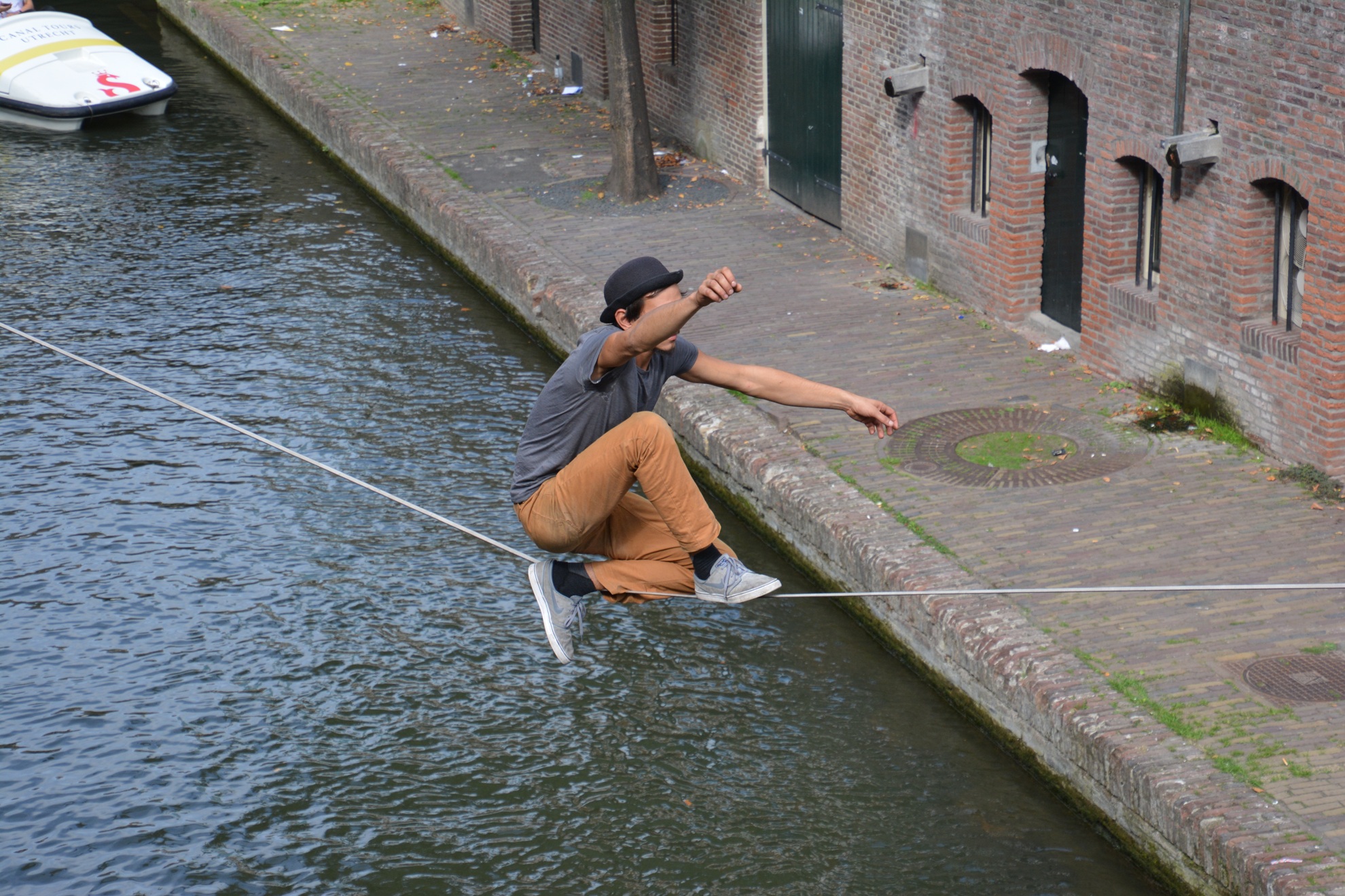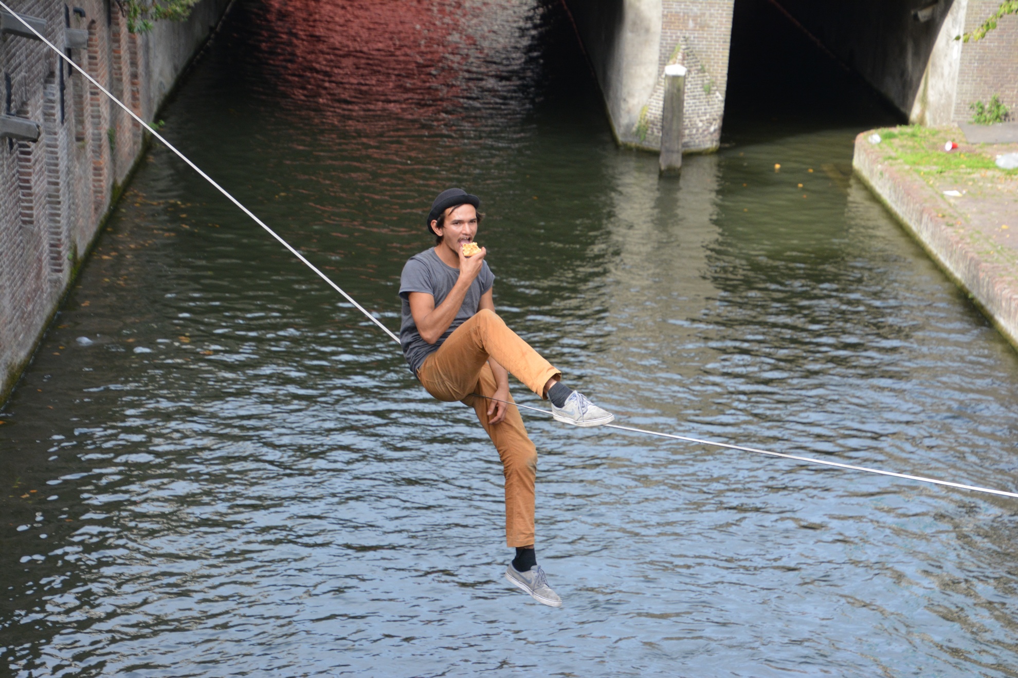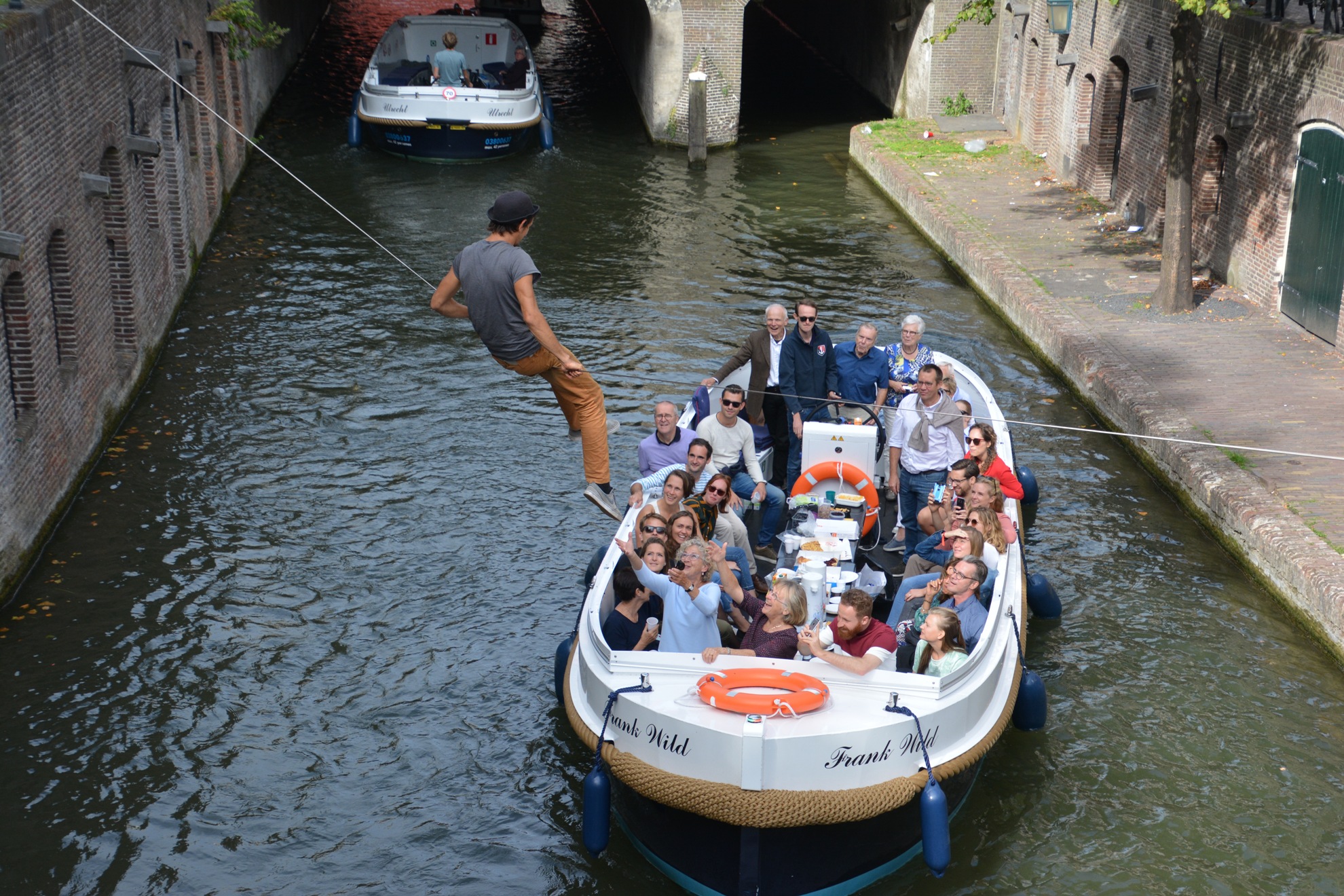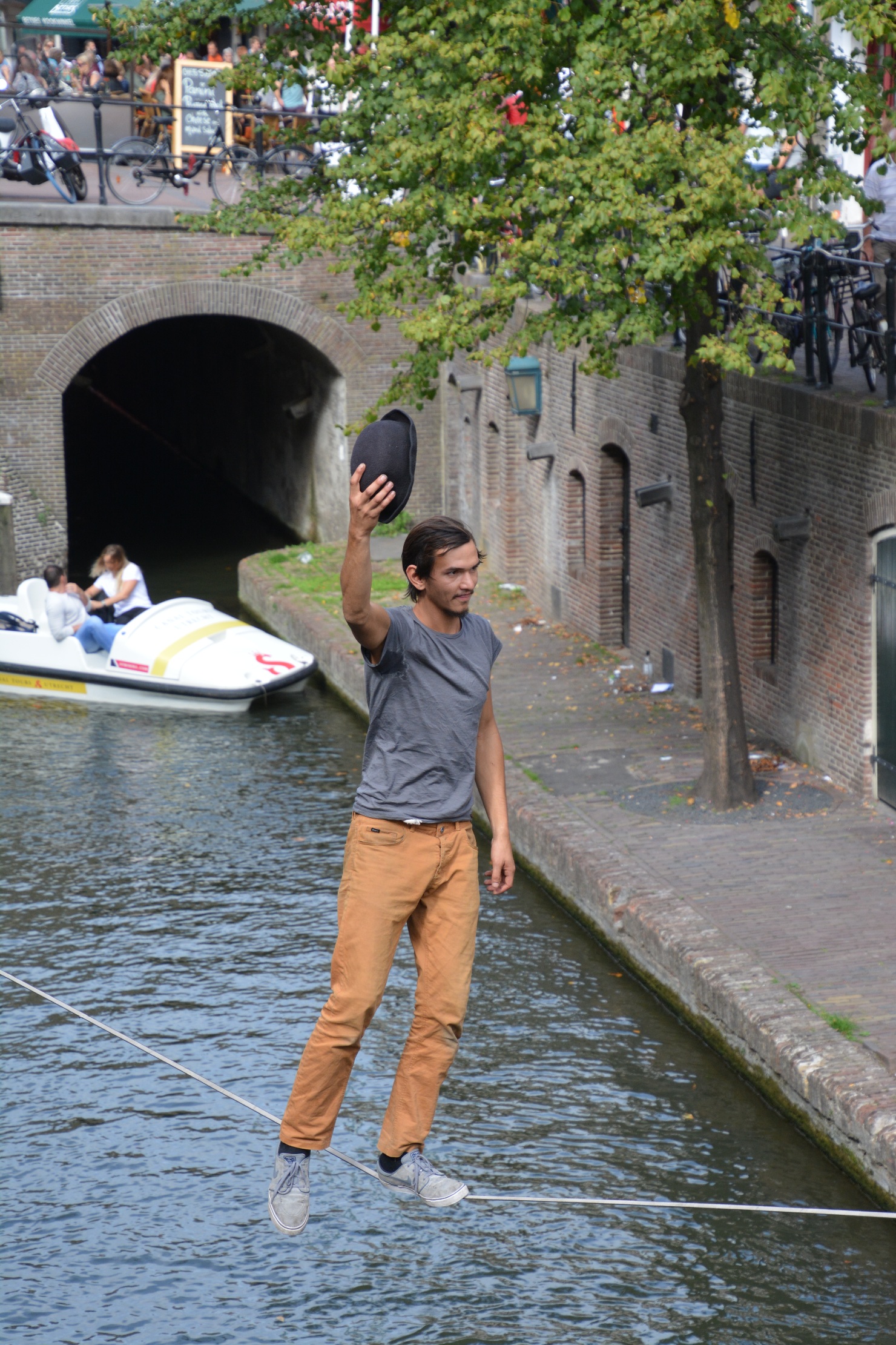 Bootjes varen onder hem door en vanuit zo'n boot (zie laatste foto's) gooit iemand hem stuk taart toe. Hij vangt het op, gaat er bij zitten als op terrasje en eet de taart lekker op.