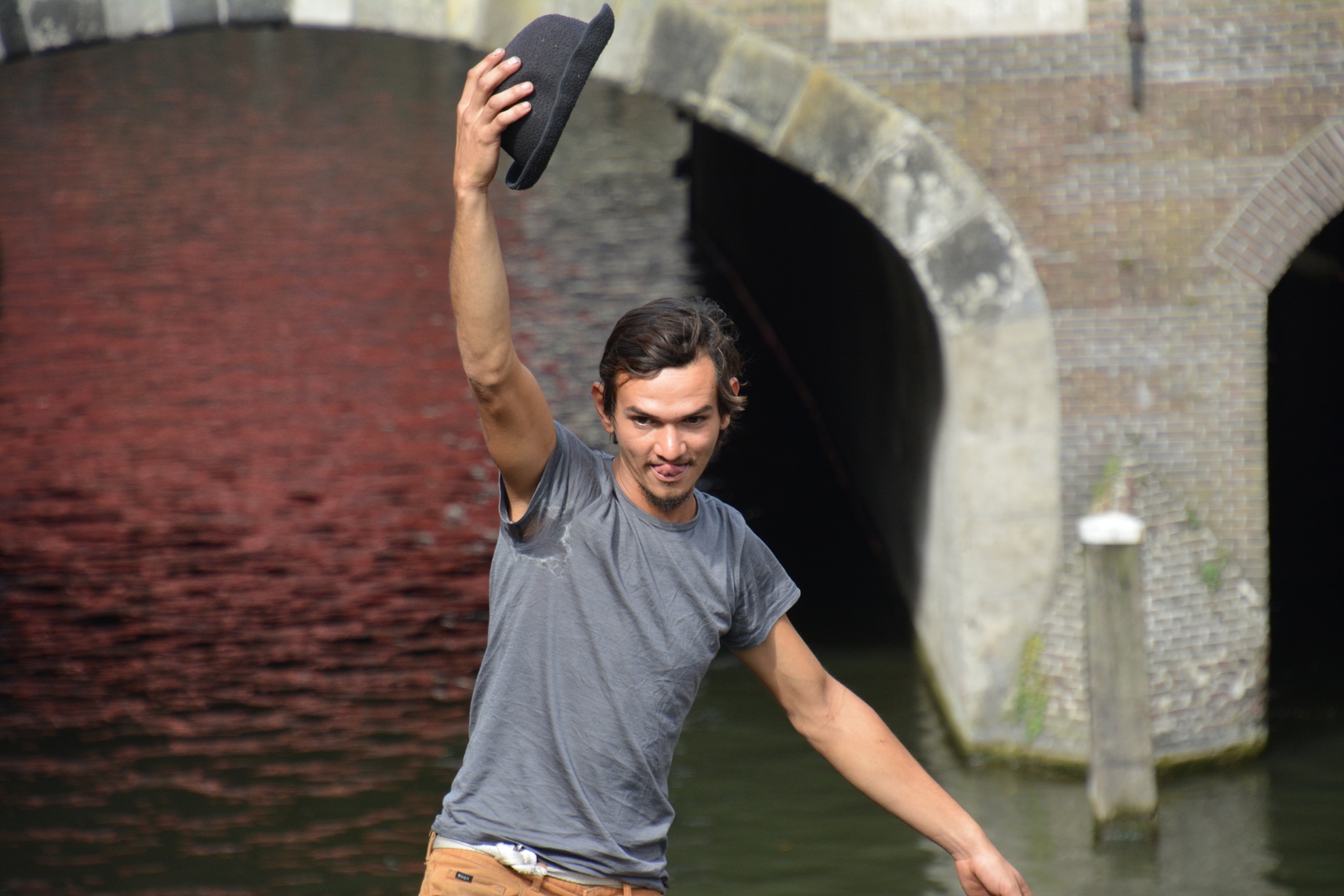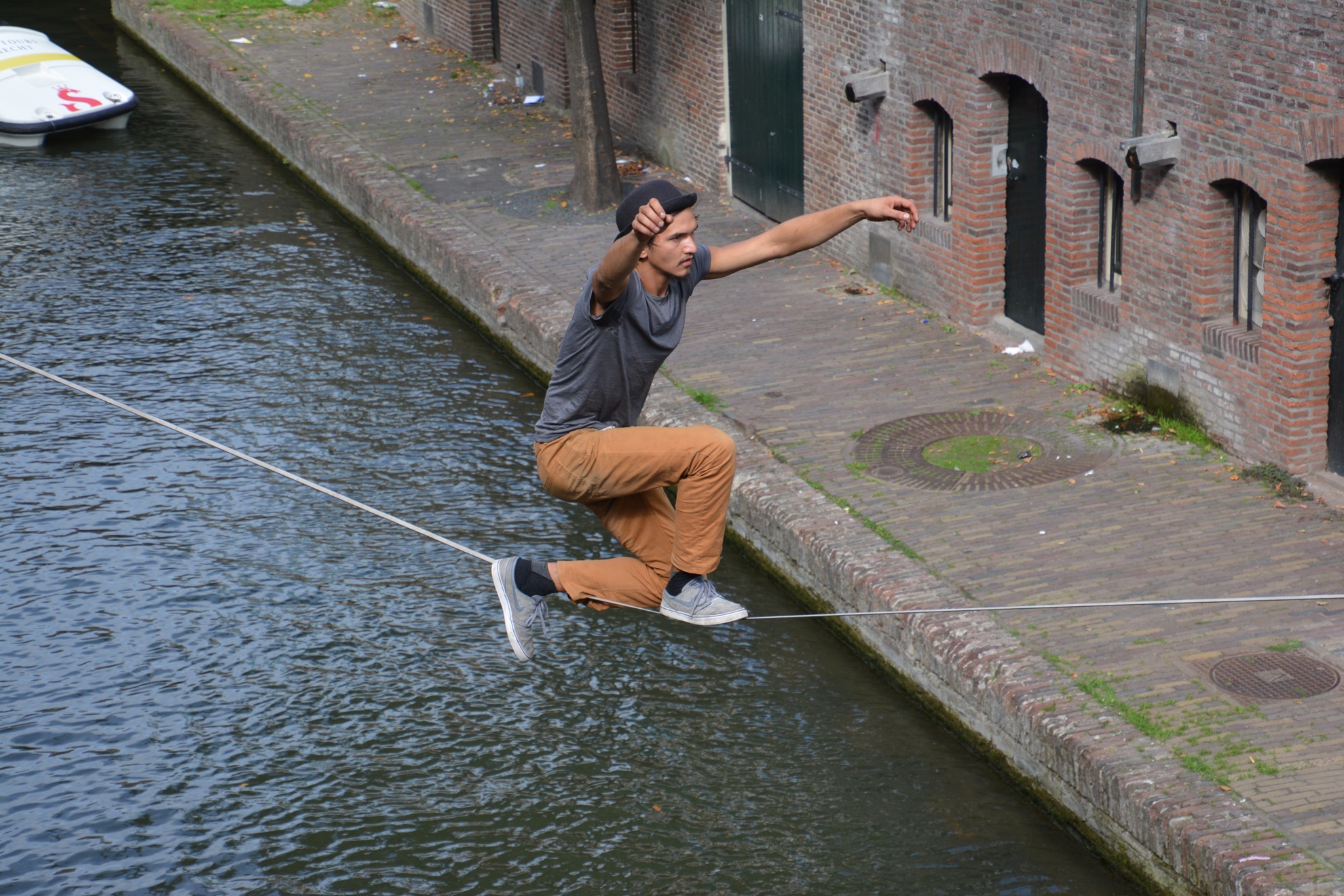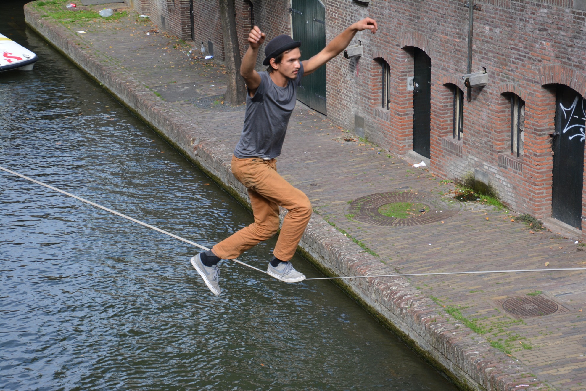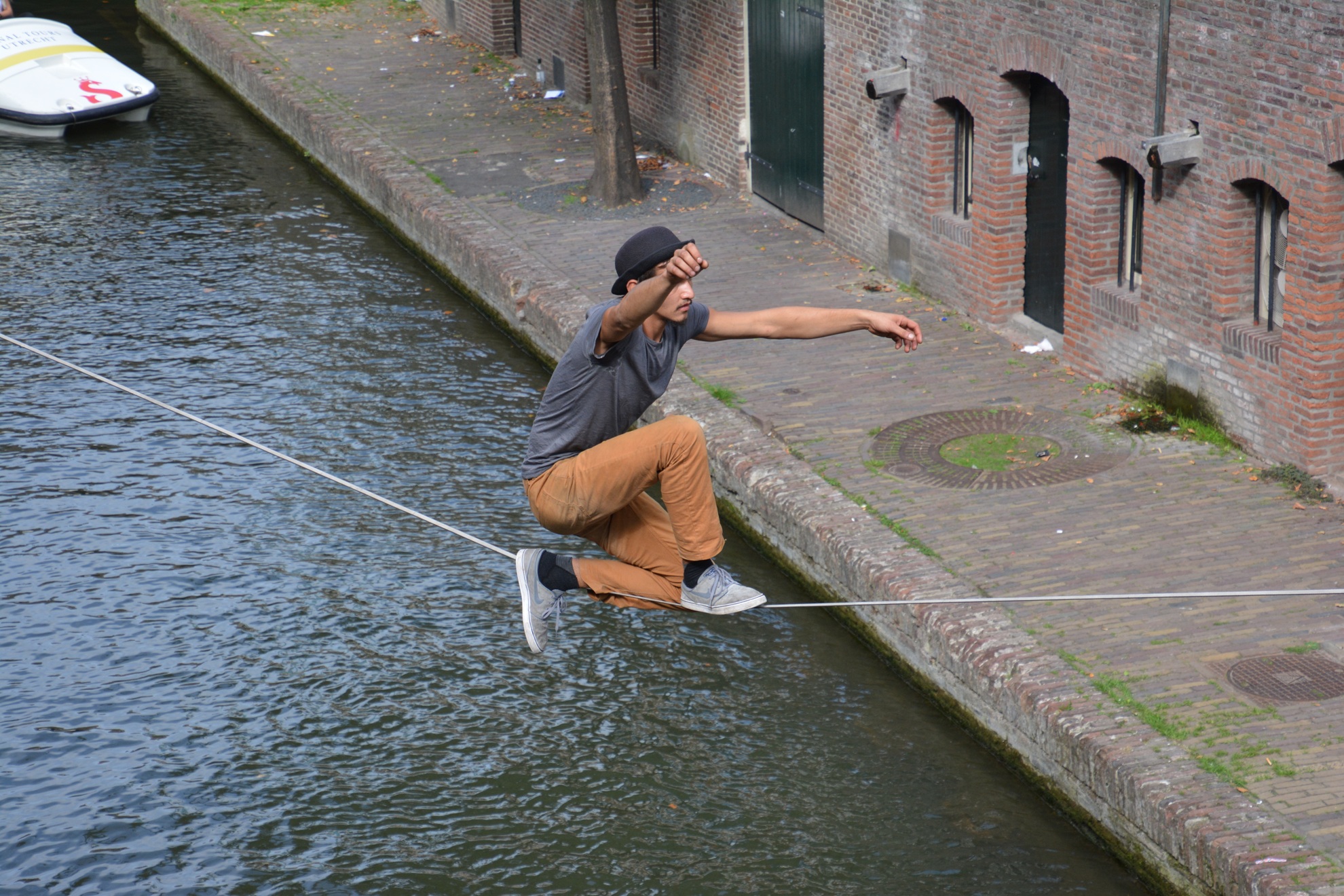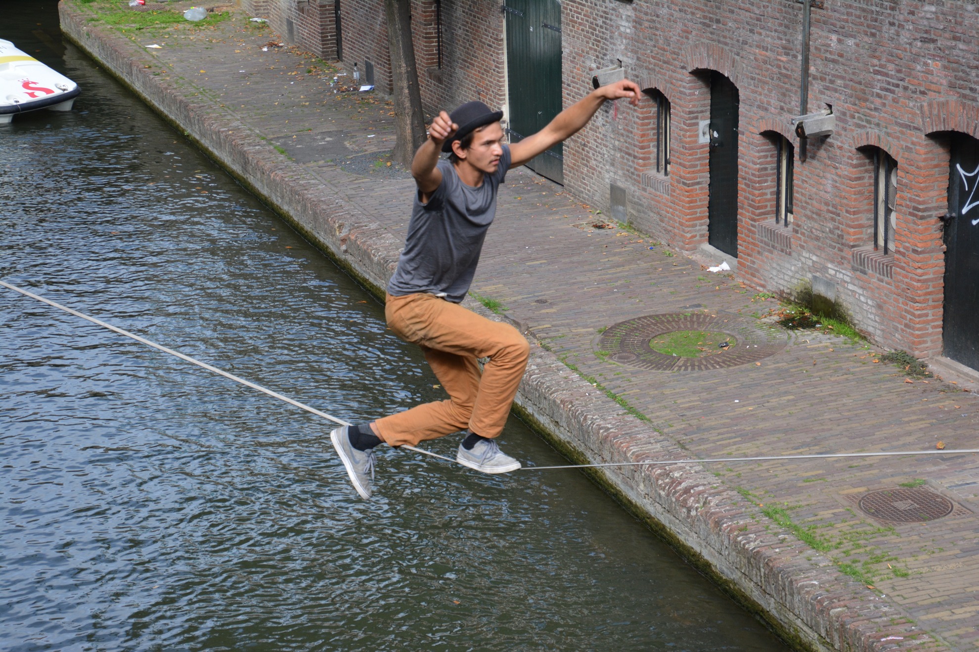 Bootjes varen onder hem door en vanuit zo'n boot (zie laatste foto's) gooit iemand hem stuk taart toe. Hij vangt het op, gaat er bij zitten als op terrasje en eet de taart lekker op.