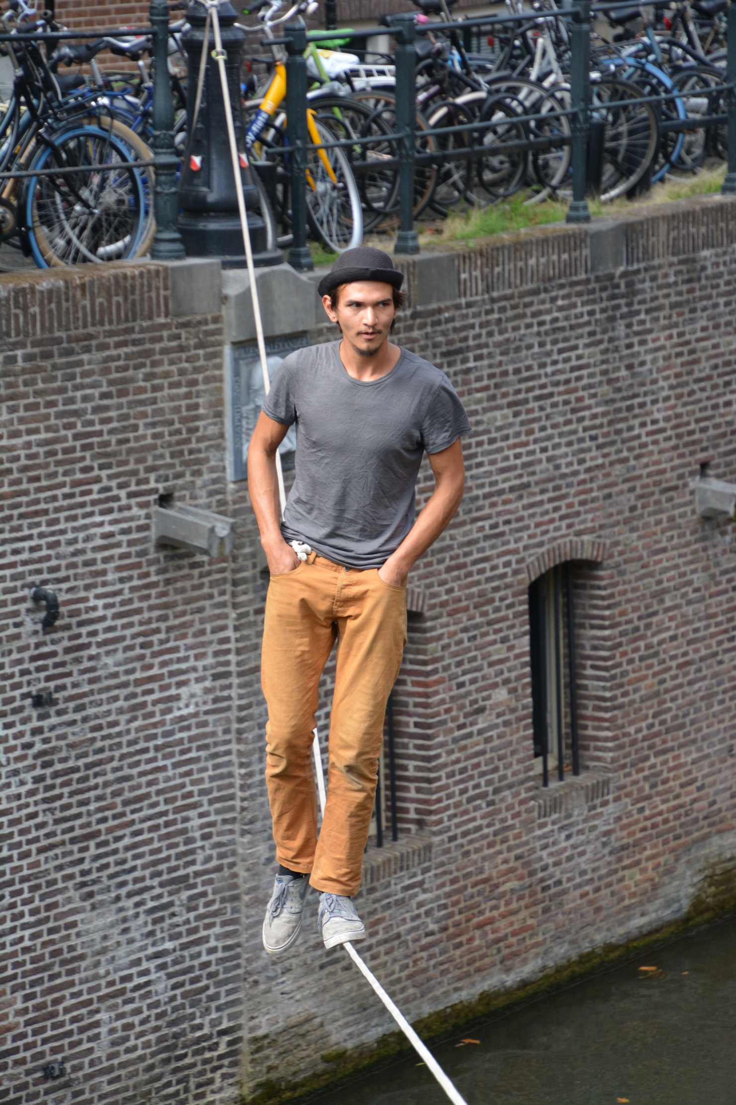 Dan loopt hij rustig heen en weer, nonchalant met handen in de zakken of bgint zelfs heen en weer te schommelen: enorme beheersing en balans.