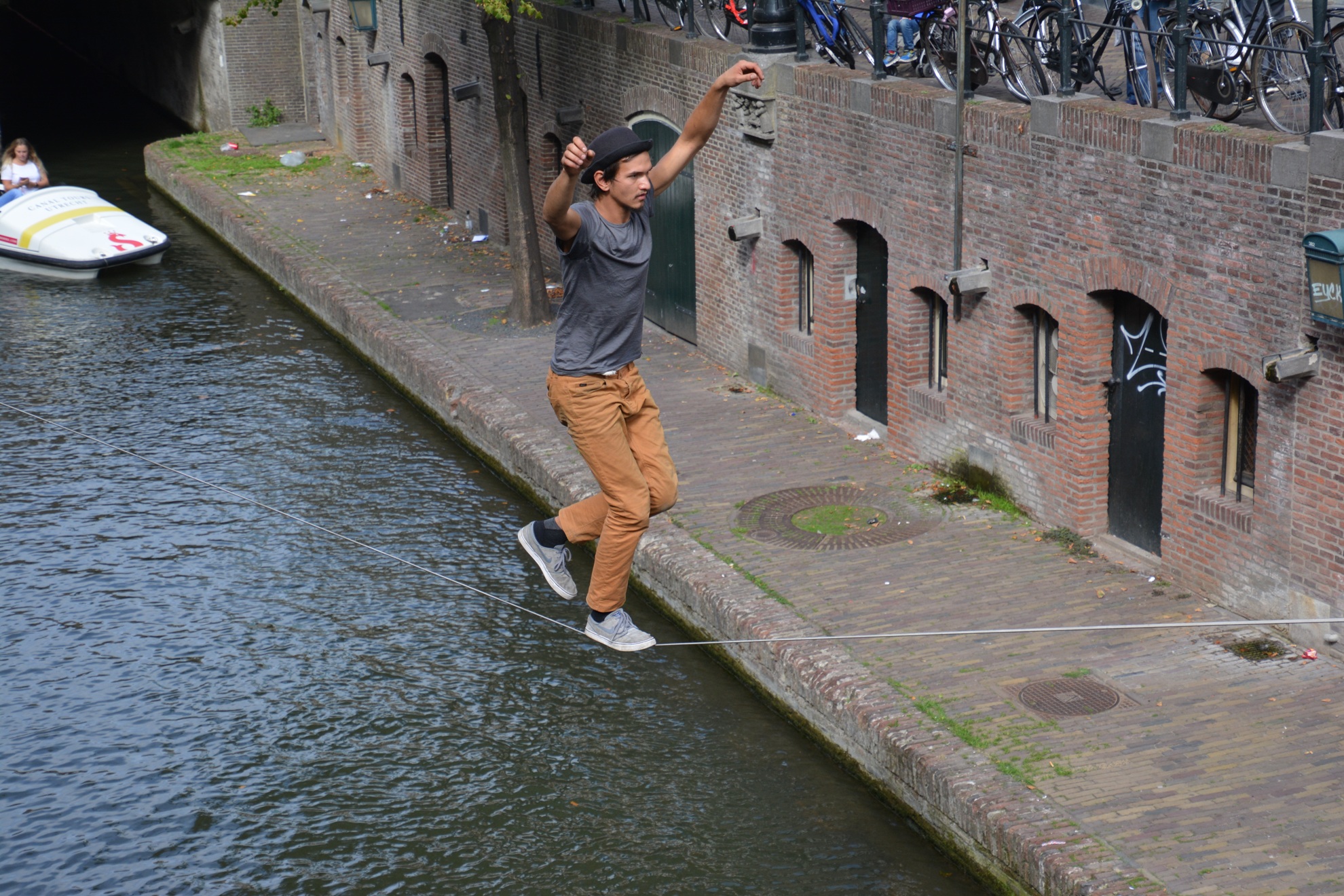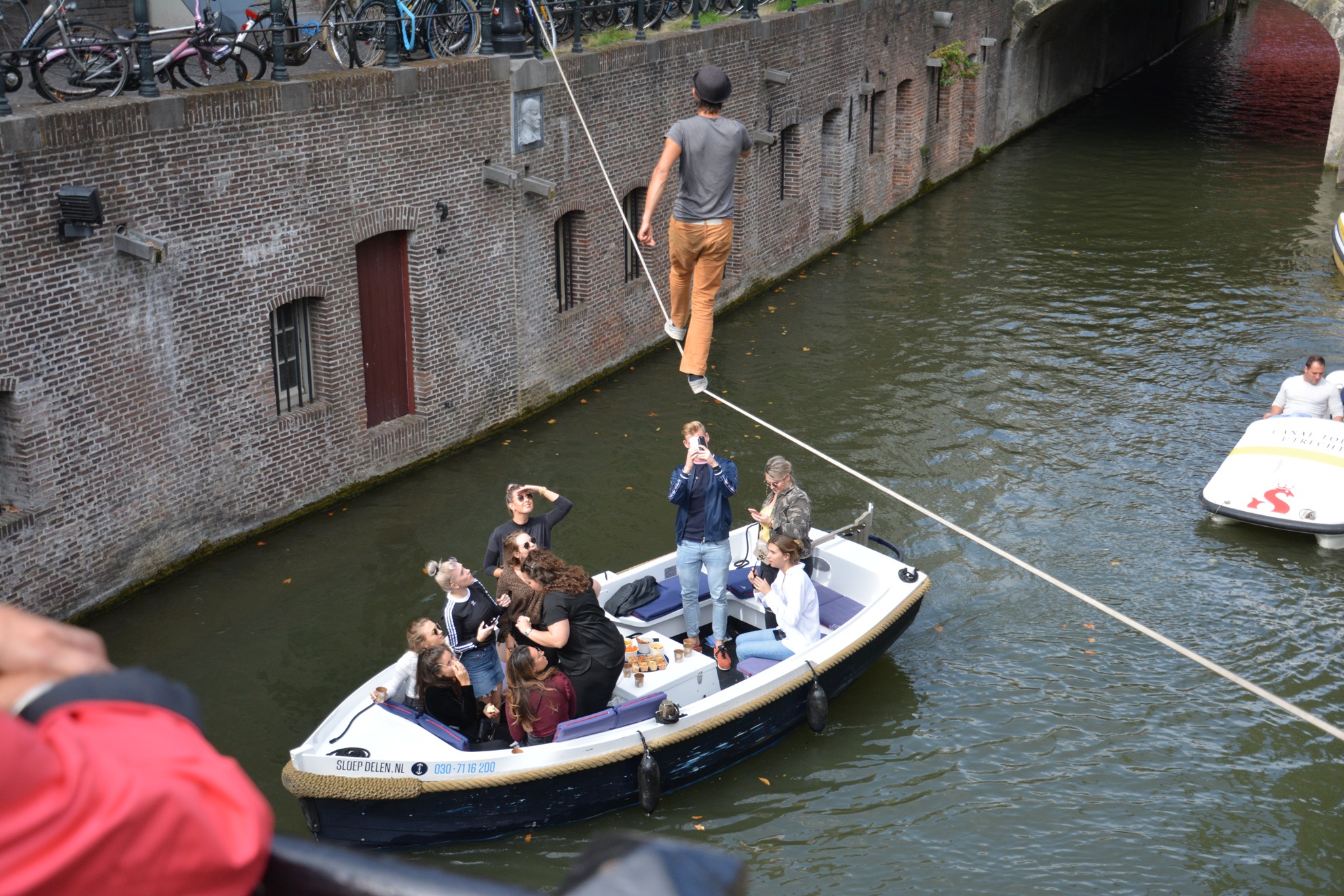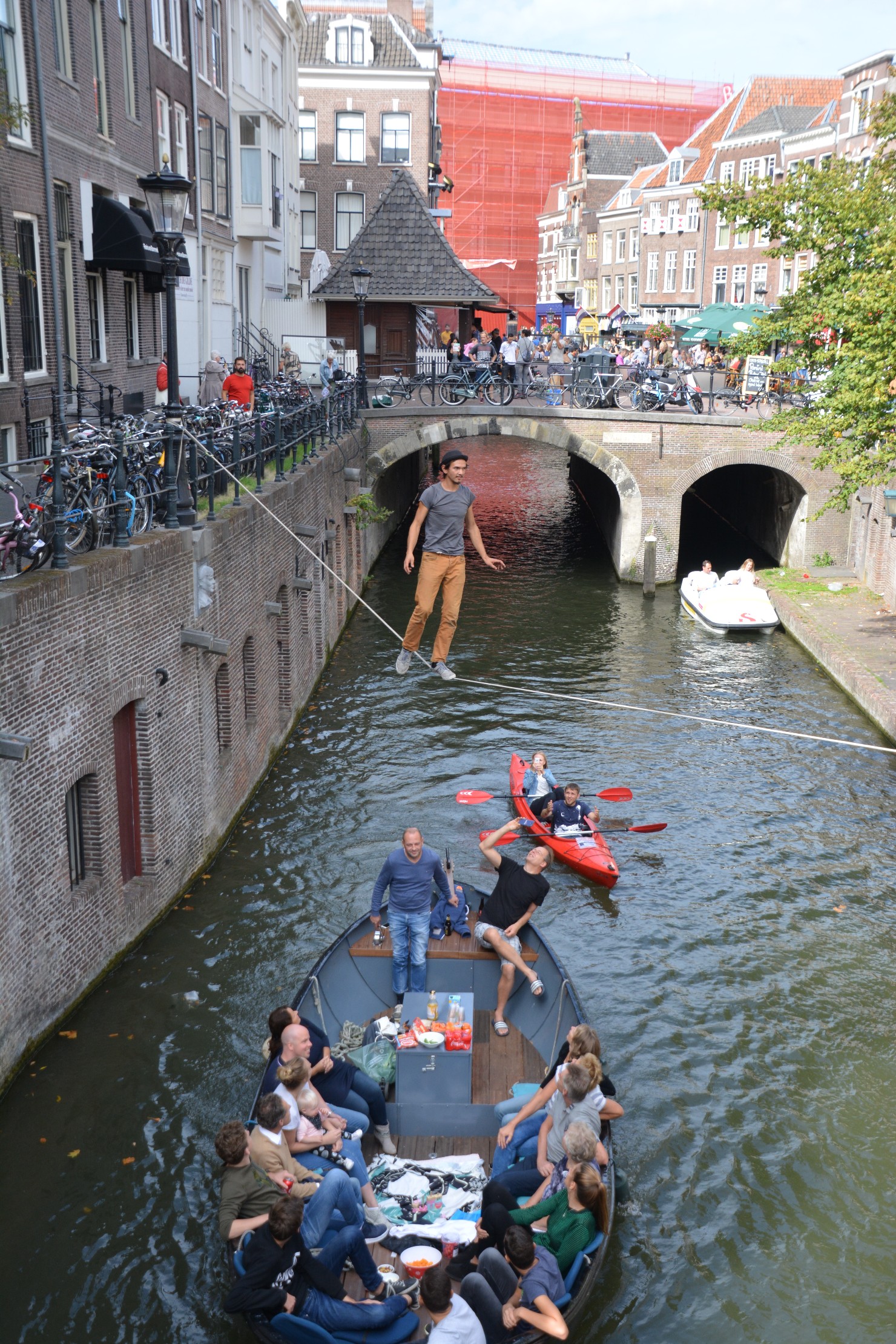 Het begint met spannen van de lijn of eigenlijk band (hooguit 2,5 cm breed?) tussen twee punten bij de Oudegracht ter hoogte van de Vismarkt, hoek of brug Zadelstraat.
