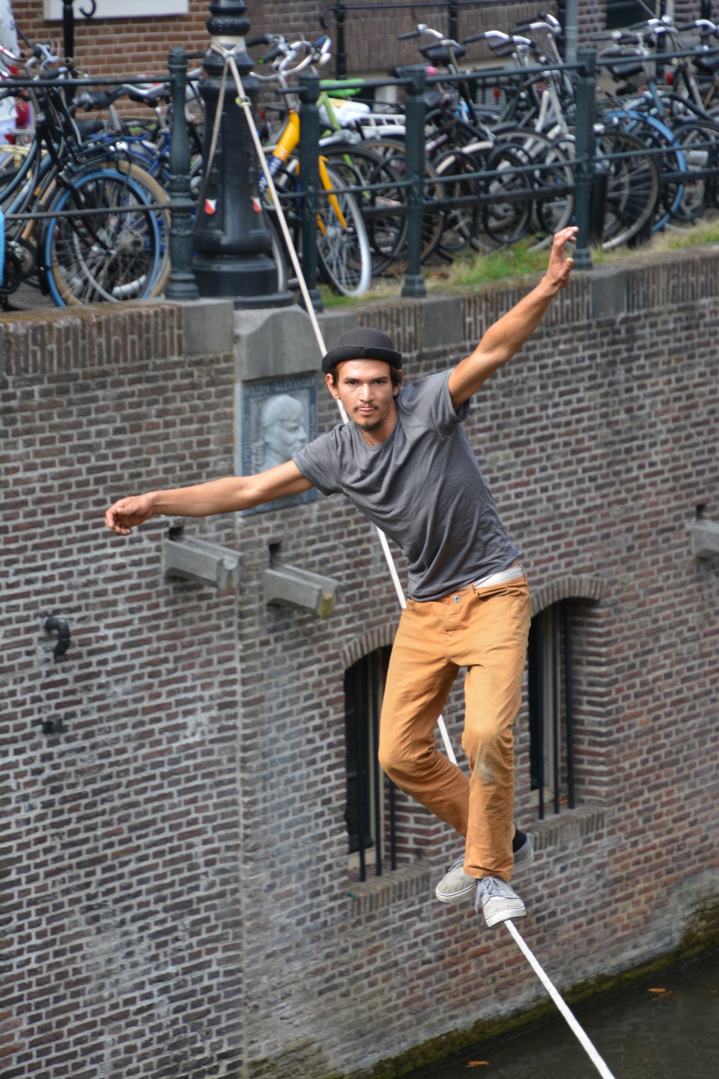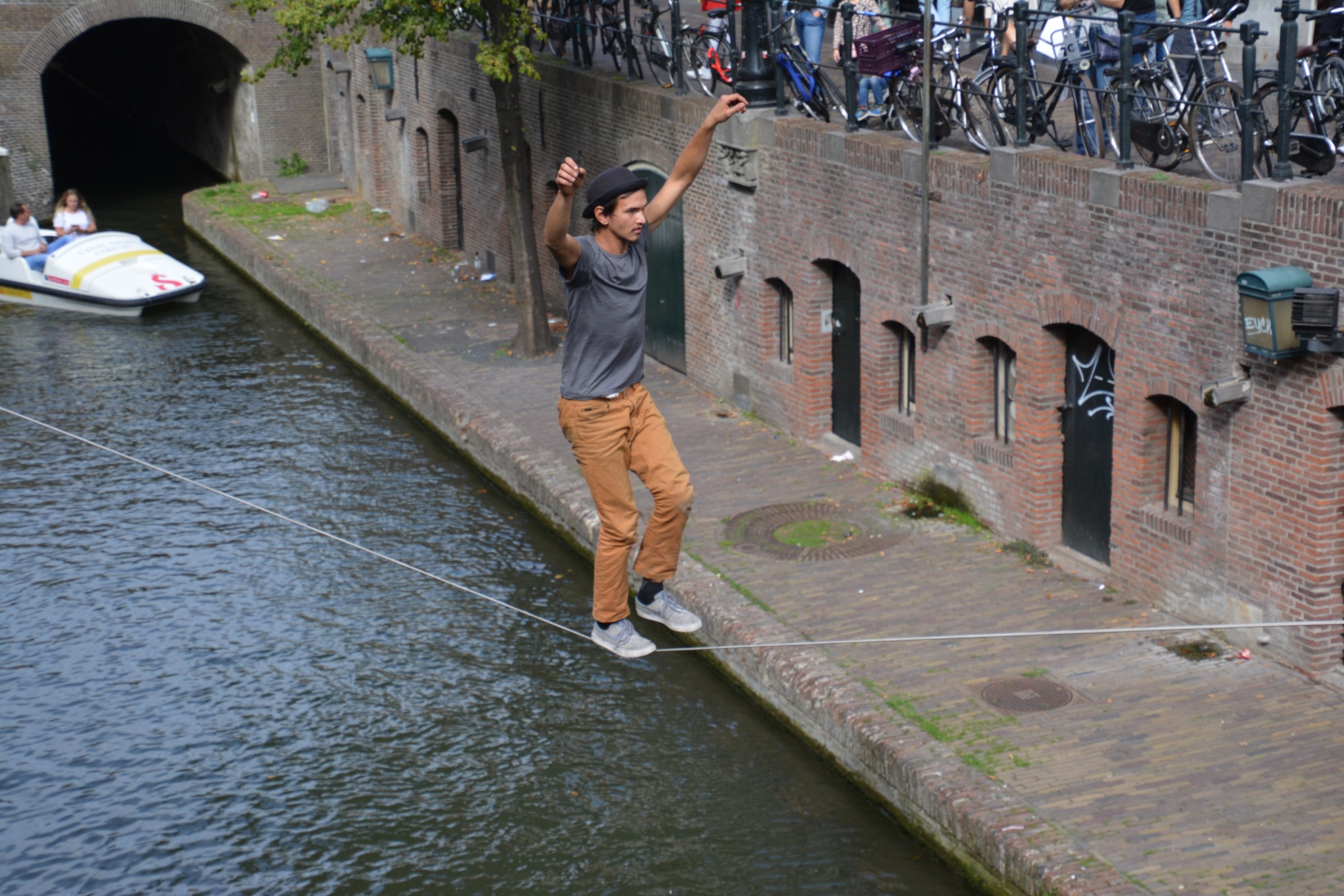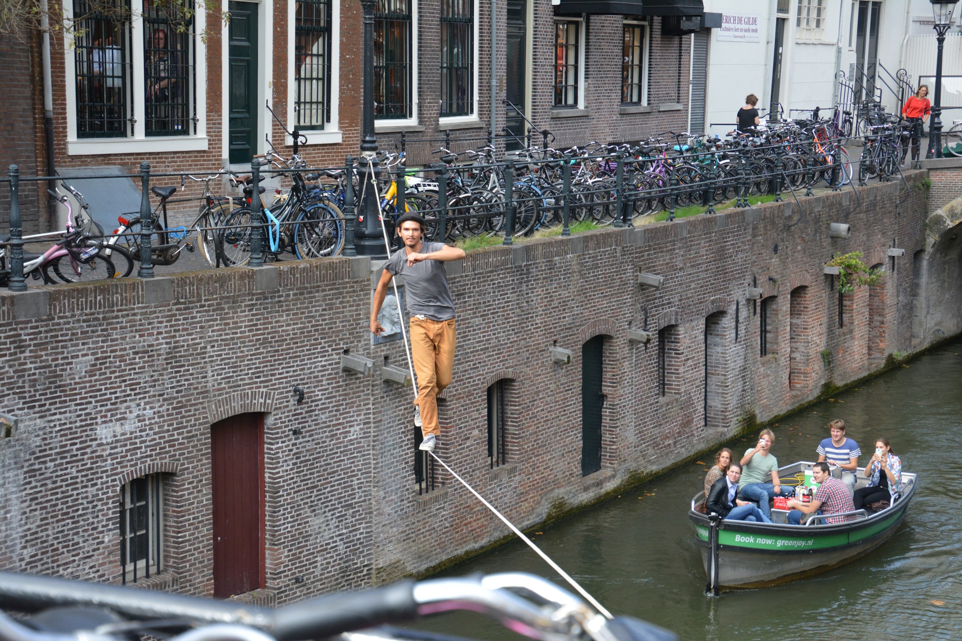 Het begint met spannen van de lijn of eigenlijk band (hooguit 2,5 cm breed?) tussen twee punten bij de Oudegracht ter hoogte van de Vismarkt, hoek of brug Zadelstraat.
